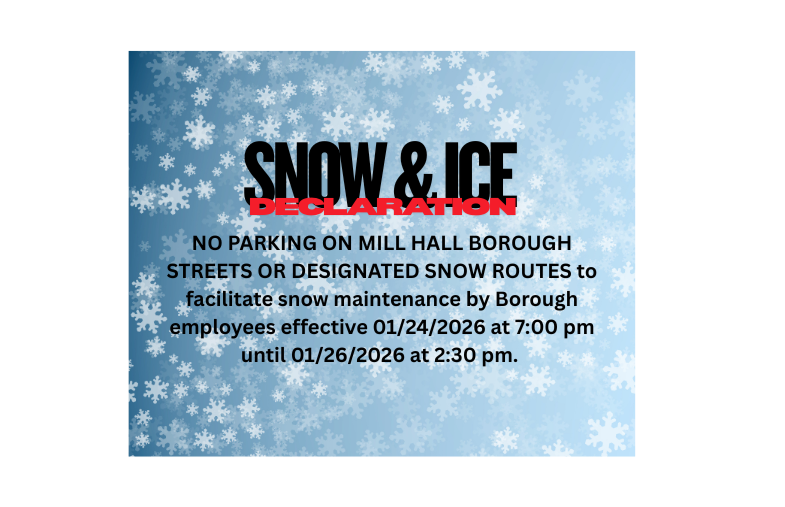 — NOTICE —  You are reminded of the Snow and Ice Removal Ordinance which states no person, firm, business or corporation owning or occupying any property within Mill Hall Borough